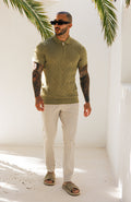 Chalbi Slim Fit Knit Pointelle Zip Polo in Green